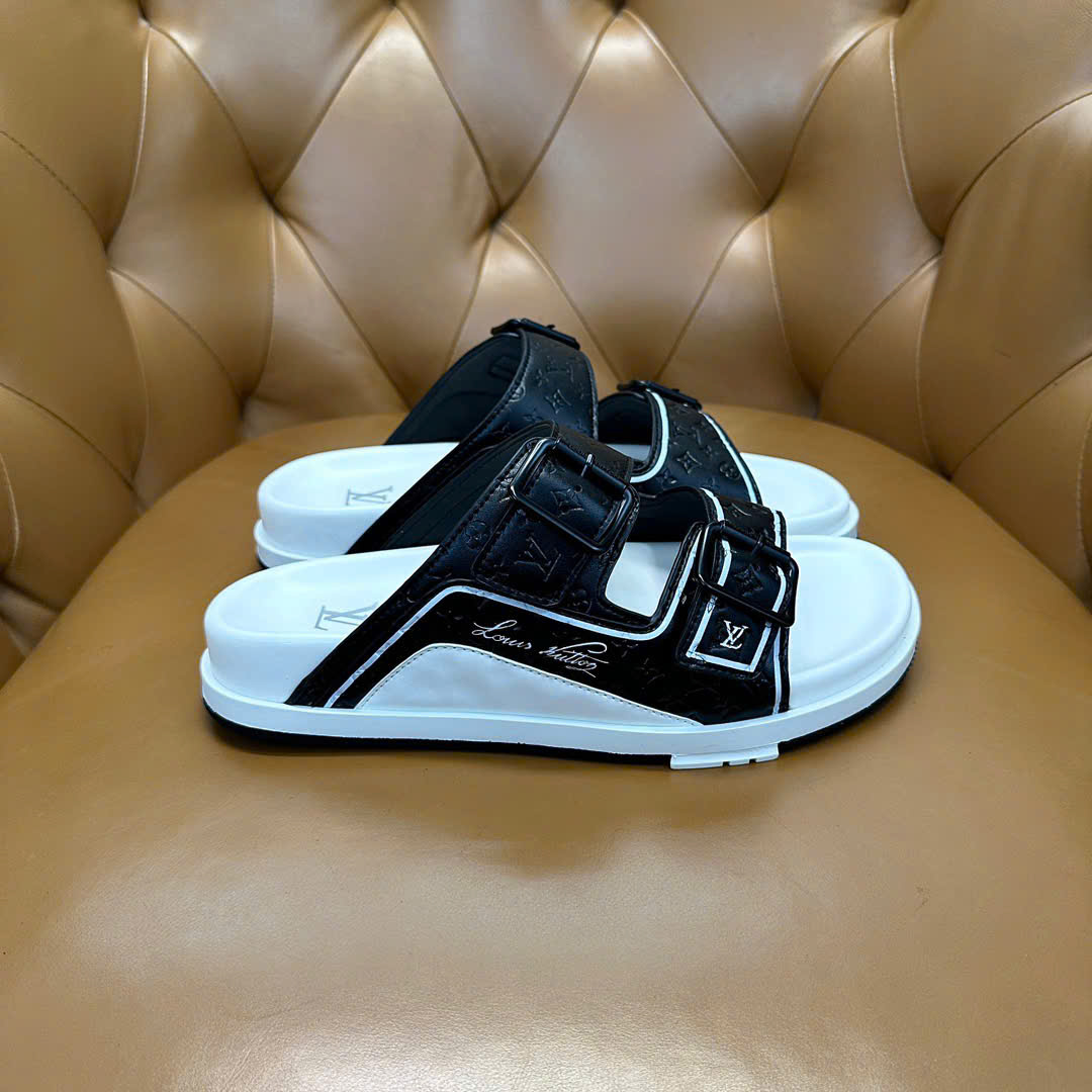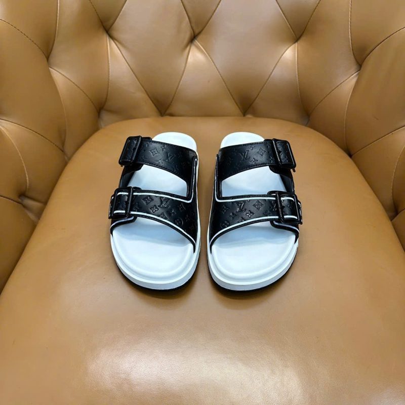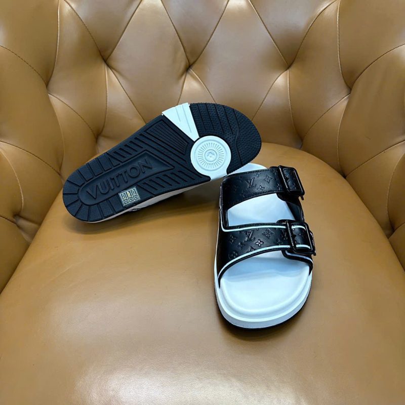 Sản phẩm được làm từ chất liệu da thật cao cấp và vật liệu tổng hợp bền bỉ, kết hợp với kỹ thuật gia công thủ công tỉ mỉ của Louis Vuitton, mang lại trải nghiệm êm ái và độ bền vượt trội. Chi tiết logo LV được khéo léo bố trí trên phần quai dép, tạo điểm nhấn thời trang đẳng cấp.