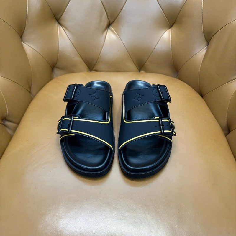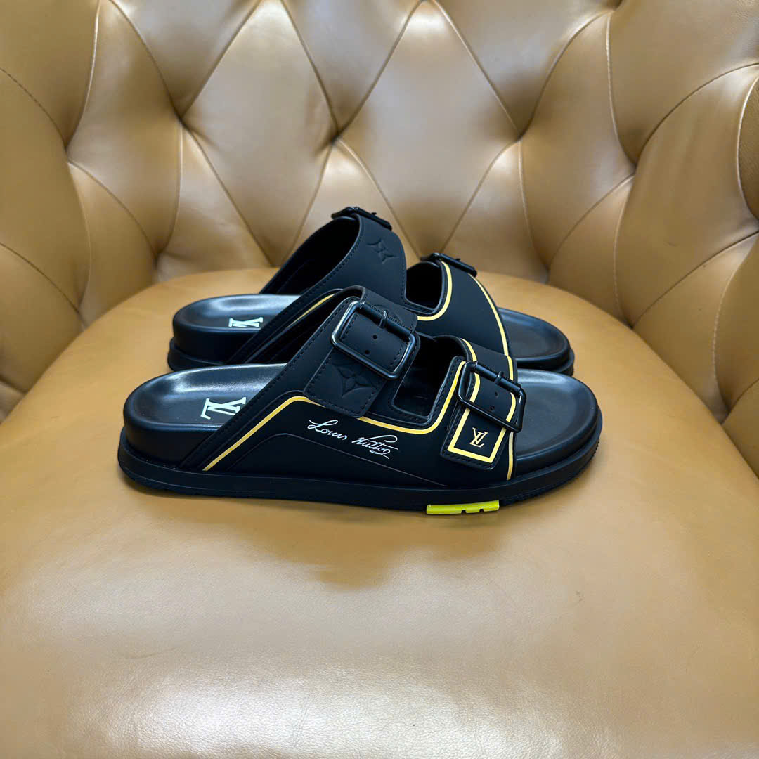 Sản phẩm được làm từ chất liệu da thật cao cấp và vật liệu tổng hợp bền bỉ, kết hợp với kỹ thuật gia công thủ công tỉ mỉ của Louis Vuitton, mang lại trải nghiệm êm ái và độ bền vượt trội. Chi tiết logo LV được khéo léo bố trí trên phần quai dép, tạo điểm nhấn thời trang đẳng cấp.