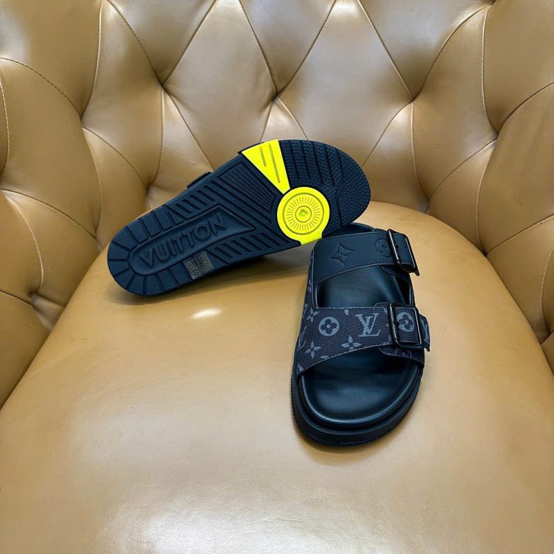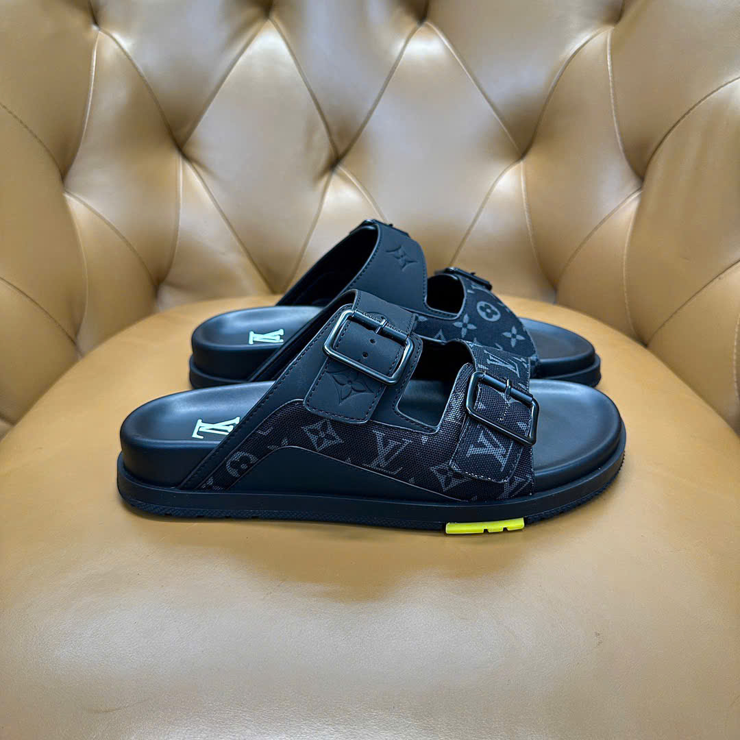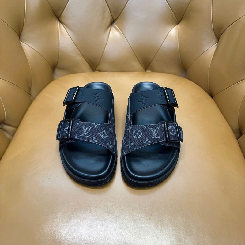 Sản phẩm được làm từ chất liệu da thật cao cấp và vật liệu tổng hợp bền bỉ, kết hợp với kỹ thuật gia công thủ công tỉ mỉ của Louis Vuitton, mang lại trải nghiệm êm ái và độ bền vượt trội. Chi tiết logo LV được khéo léo bố trí trên phần quai dép, tạo điểm nhấn thời trang đẳng cấp.