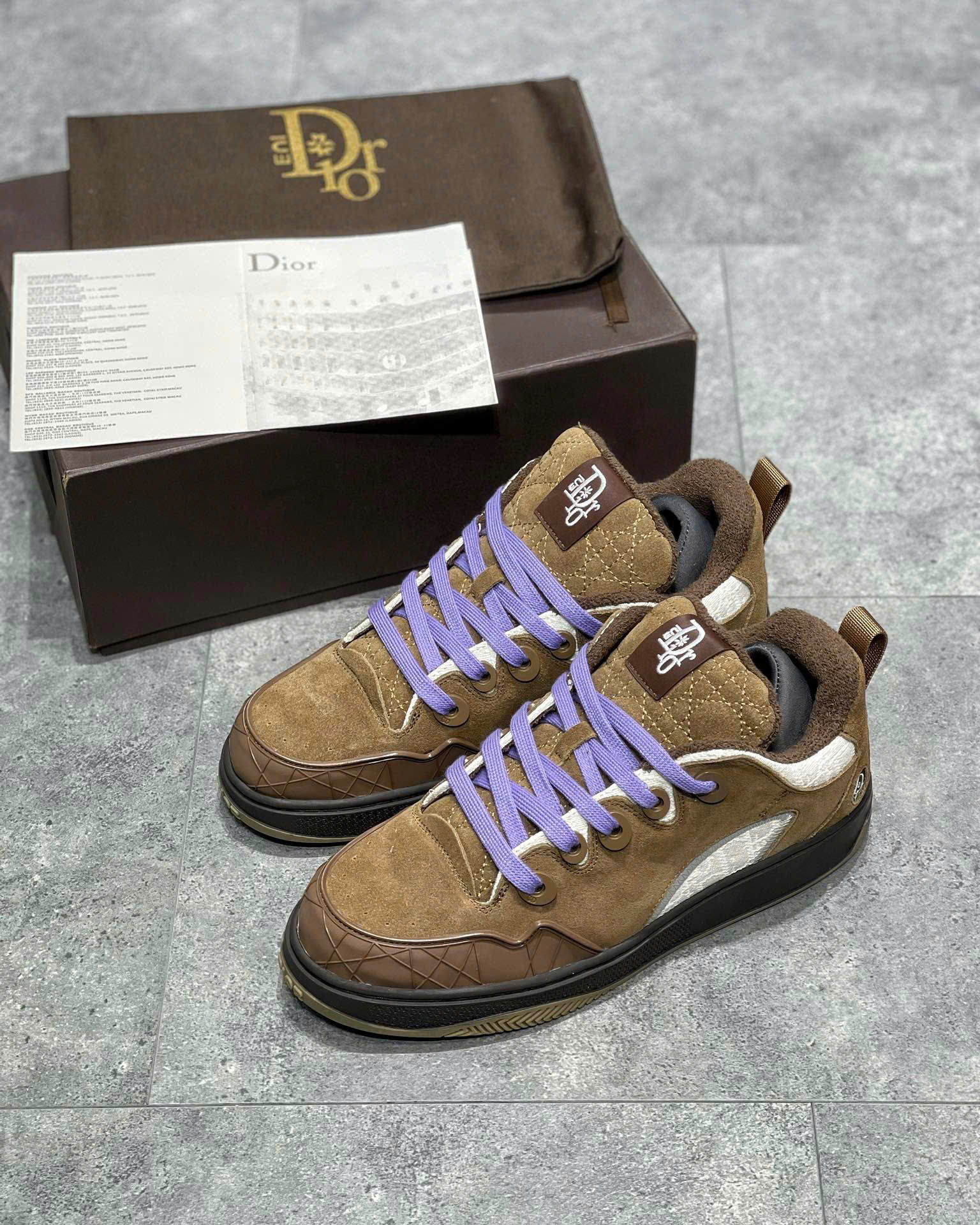 Thiết kế độc đáo: Phom dáng skater năng động, khỏe khoắn với các chi tiết in ấn và thêu logo Dior tinh tế trên thân giày.