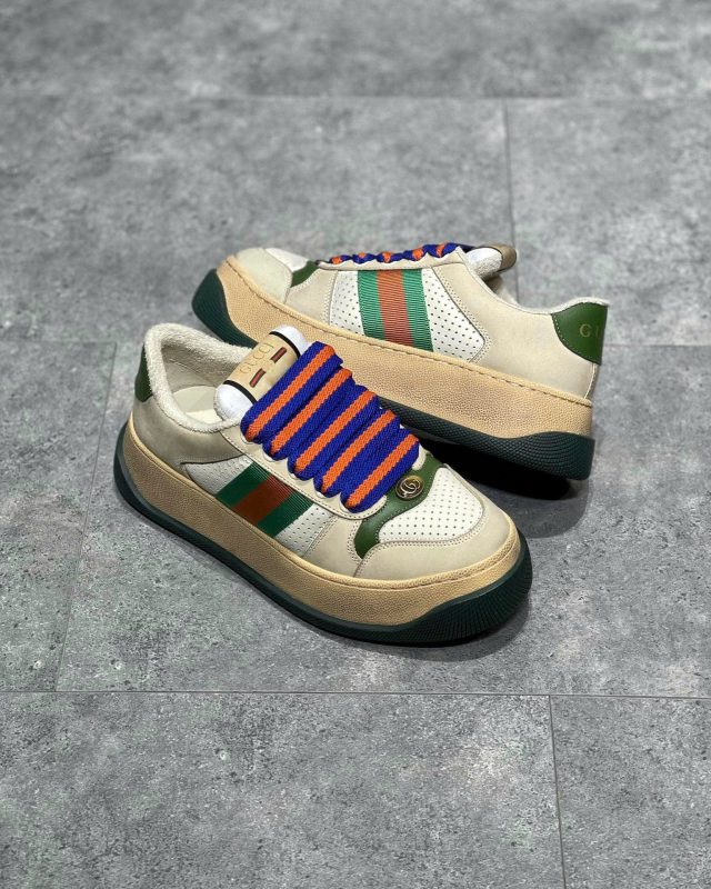Giày Gucci Screener nổi bật với kiểu dáng độc đáo, phối màu tinh tế và các chi tiết logo đặc trưng, tạo nên nét riêng biệt không thể nhầm lẫn.