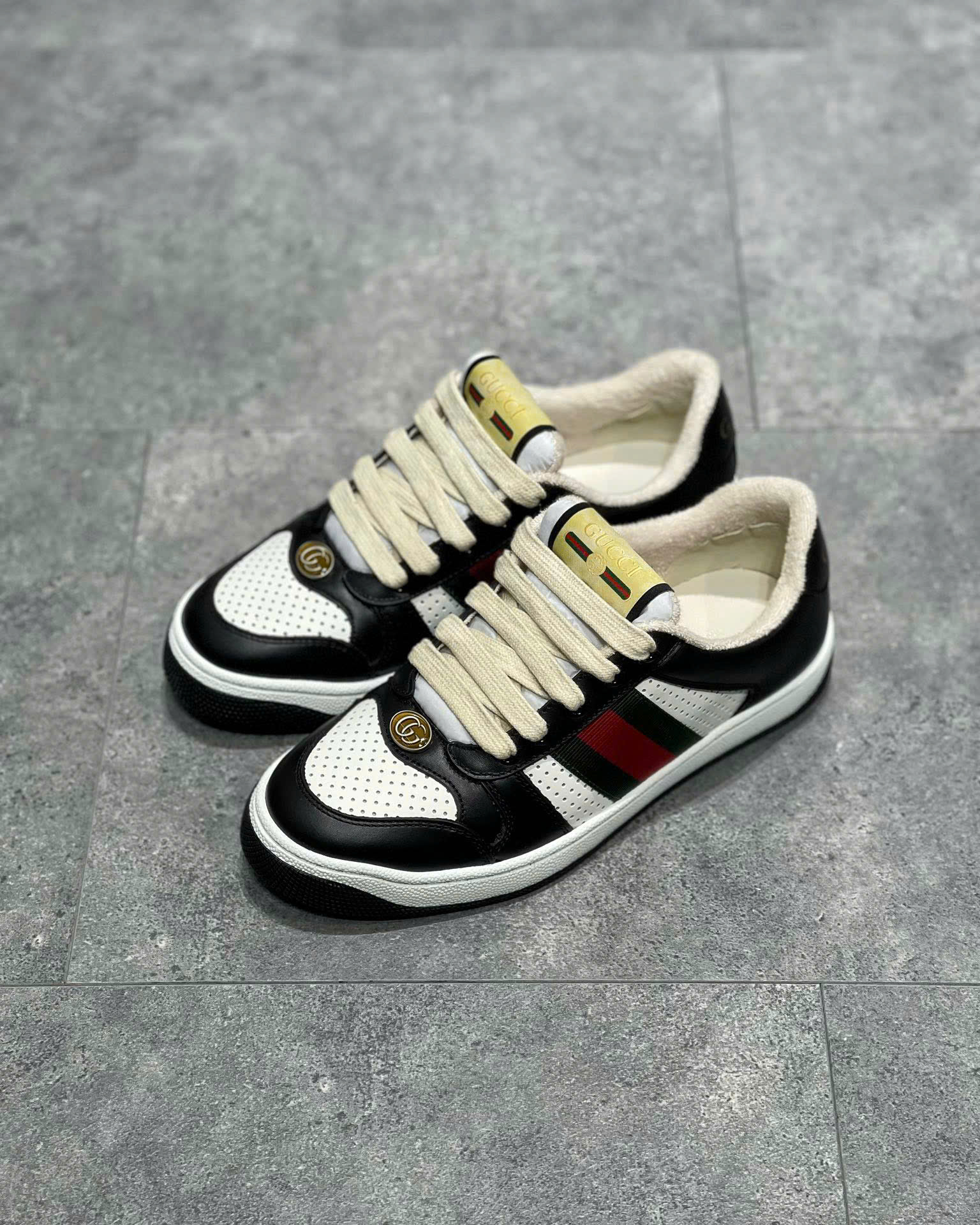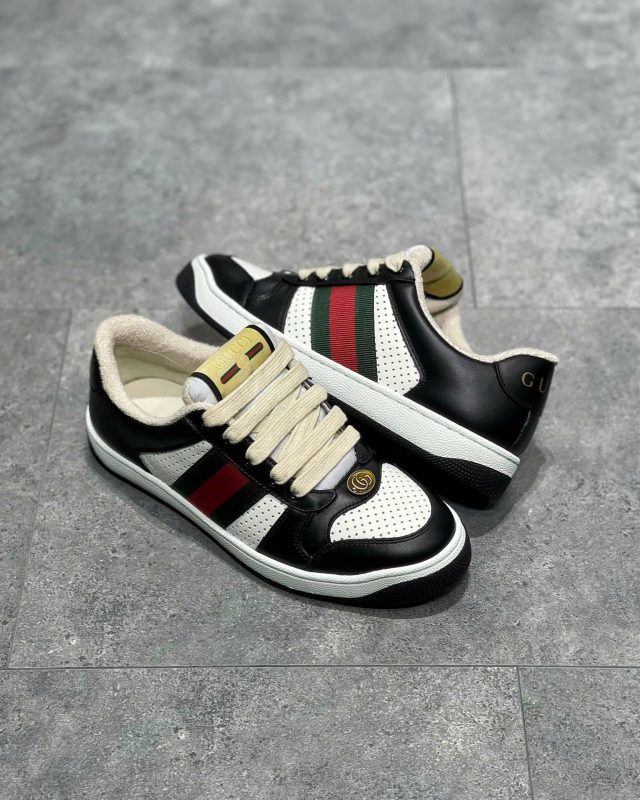 Giày Gucci Screener nổi bật với kiểu dáng độc đáo, phối màu tinh tế và các chi tiết logo đặc trưng, tạo nên nét riêng biệt không thể nhầm lẫn.