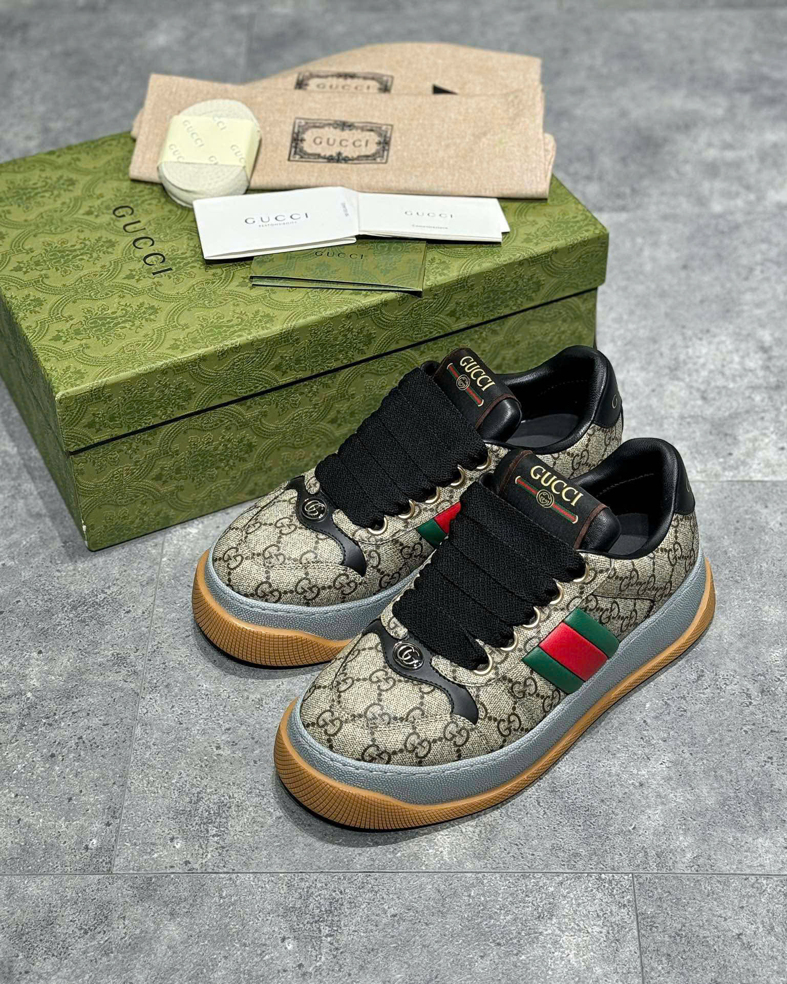 Giày Gucci Screener nổi bật với kiểu dáng độc đáo, phối màu tinh tế và các chi tiết logo đặc trưng, tạo nên nét riêng biệt không thể nhầm lẫn.
