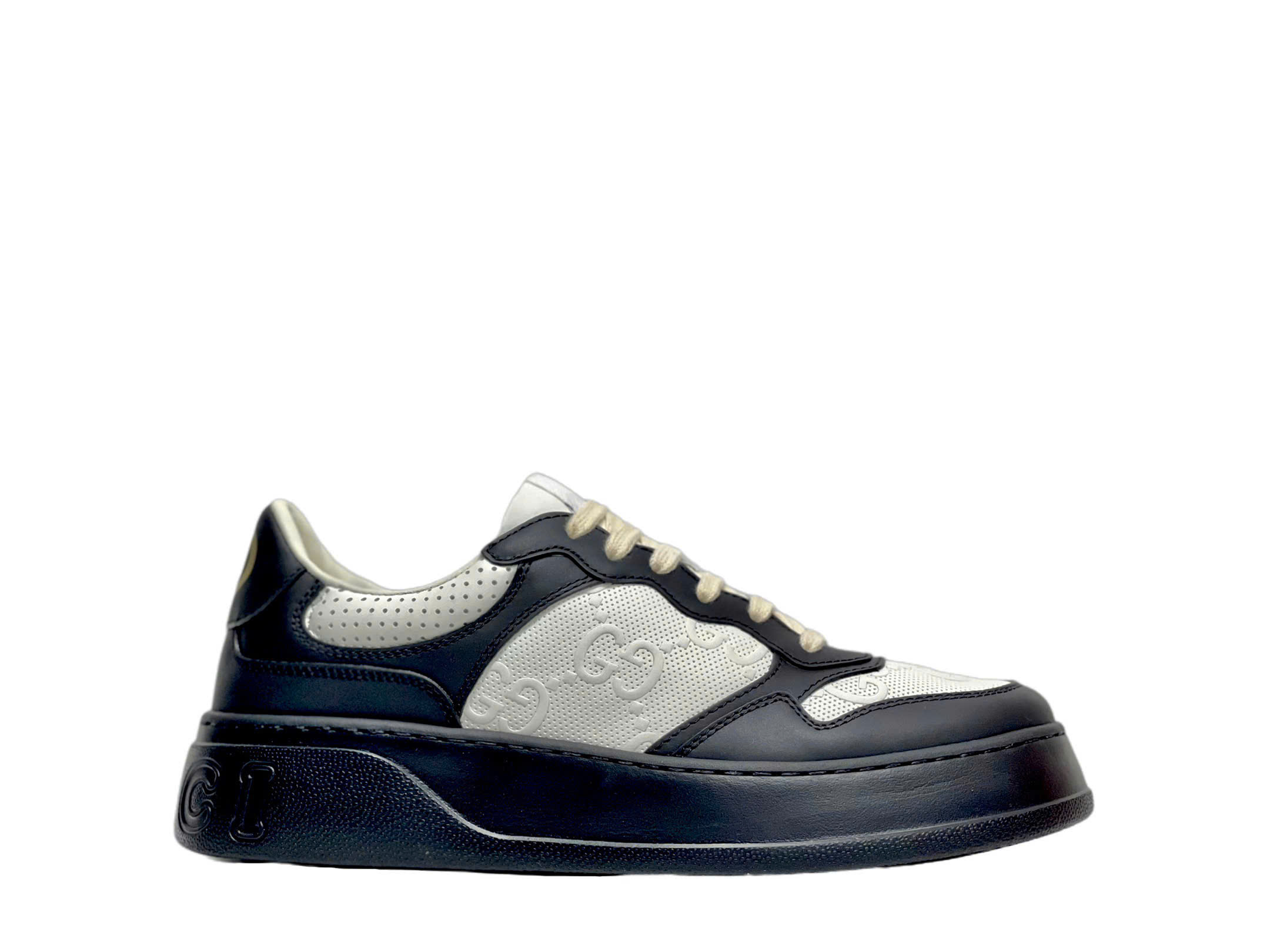 • Chất liệu da cao cấp: Thân giày làm từ da thật mềm mại, được xử lý kỹ thuật embossing giúp nổi bật logo Gucci trên bề mặt da.